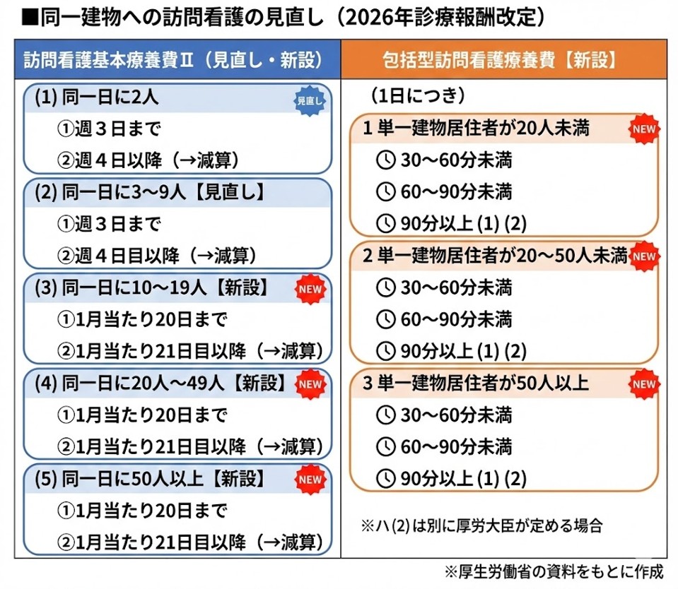 | 訪問看護報酬の見直し内容 包括型報酬の新設: 1日単位で算定する「包括型訪問看護療養費」を導入。難病患者等への頻回な訪問を1日単位で評価。 算定ルールの厳格化: 同一建物への訪問は30分以上を標準とし、20分未満は原則算定不可。近接する建物も同一扱いに。 加算の適正化: 夜間・早朝や複数名訪問等の加算についても、同一建物内の訪問人数に応じた評価へと見直し。 |